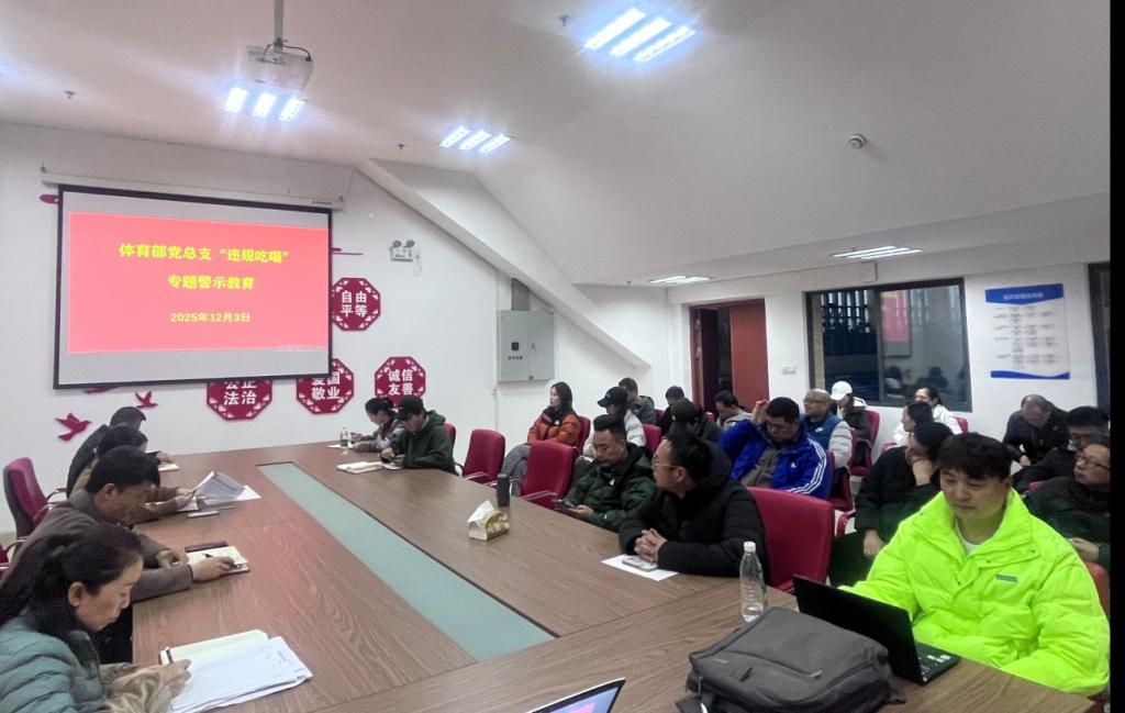 为深入贯彻落实全面从严治党要求,持续深化作风建设,进一步拓展深入贯彻中央八项规定精神学习教育成果,12月3日上午,体育部党总支组织开展了“违规吃喝”专题警示教育活动,体育部全体教职工参加了会议,会议由党总支书记朱海涛主持。