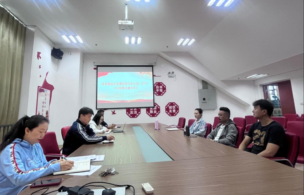 4月13日上午,体育部党总支在体育馆T206会议室组织召开理论学习中心组(扩大)集中学习。党总支全体委员、科级以上干部、党支部书记、教研室主任参加了会议,会议由党总支书记朱海涛主持。