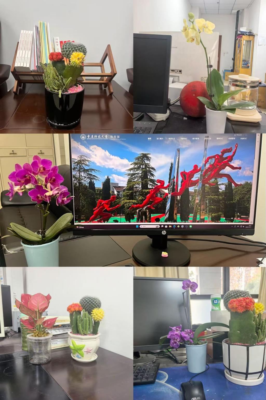 12月4日至12月7日,活动进入集中实施阶段,各教研室、办公室迅速行动,掀起了办公环境美化热潮。教职工们以集体智慧为依托,结合自身岗位特点与队伍特色,从“净、序、韵”三个维度开展建设工作:在环境营造上,大家对办公室地面、墙面、桌面、门窗进行全面深度清洁,细致清除灰尘、杂物与污渍,筑牢整洁干净的环境基础,让办公空间尽显秩序与规范之美;在理念传递上,对办公桌上的文件资料、办公用品进行系统整理归类,实现合理摆放、整齐有序,有效提升办公效率的同时,展现出严谨务实的工作作风;在文化厚植上,教职工们充分发挥创意,精心挑选各类绿色植物、特色摆件等装饰品,将体育元素与自然生机融入办公空间,天堂鸟的葱郁、仙人掌的可爱、蝴蝶兰的美丽、红掌的生机与运动器材相映成趣,既为办公室增添了蓬勃活力,也让教职工在自然气息中舒缓工作压力、激发工作灵感,实现了文化内涵与自然生机的双重育人功效。