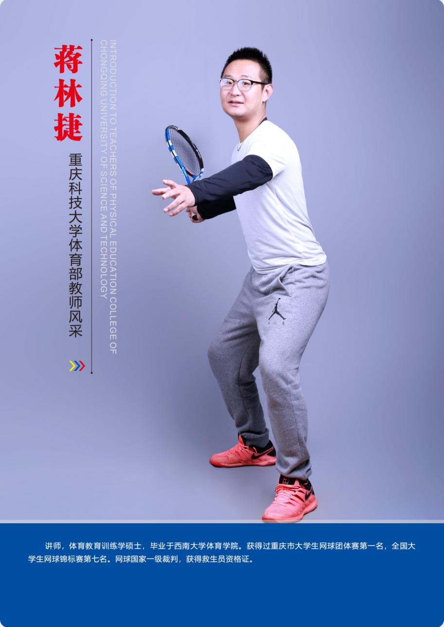 讲师,体育教育训练学硕士,毕业于西南大学体育学院。获得过重庆市大学生网球团体赛第一名,全国大学生网球锦标赛第七名。网球国家一级裁判,获得救生员资格证。